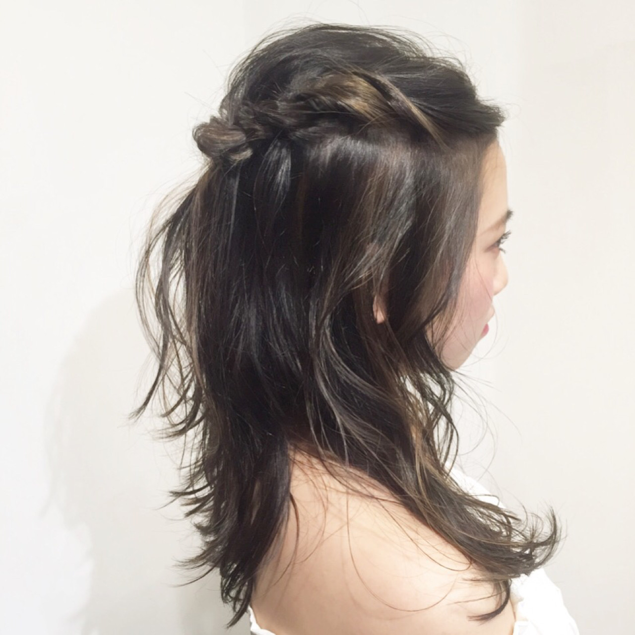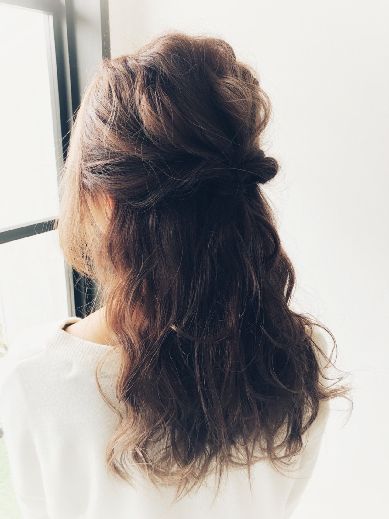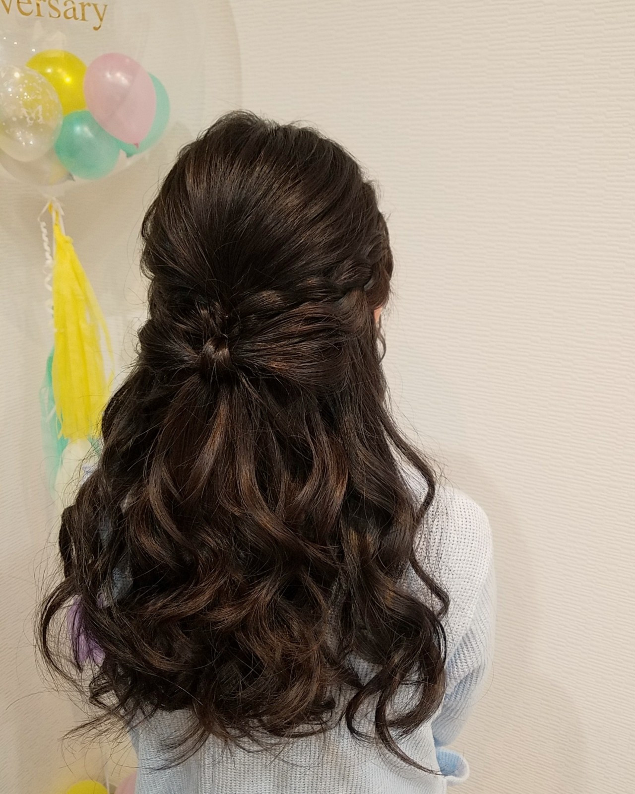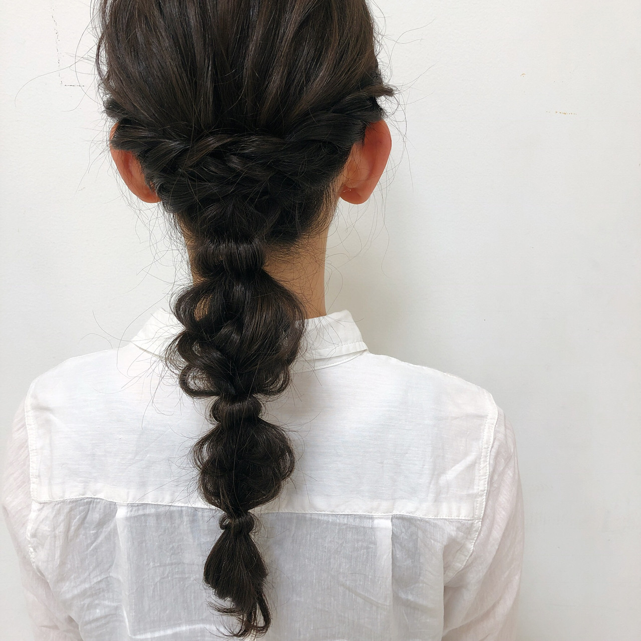 利用麻花辮×馬尾所打造出的簡單編髮造型。在束起來的地方抓些髪絲來打一個蝴蝶結