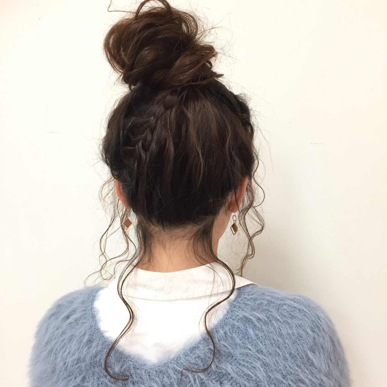 綁個公主頭,然後將髮束捲捲捲在一起再用橡皮筋綁住,只要這樣便能完成的簡單髮型♡