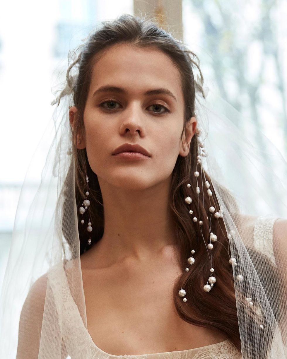 想要挑選素雅頭紗的新娘,可以選擇在髮後掛上一串串的珍珠,讓頭紗保持簡約但又有視覺上的張力。