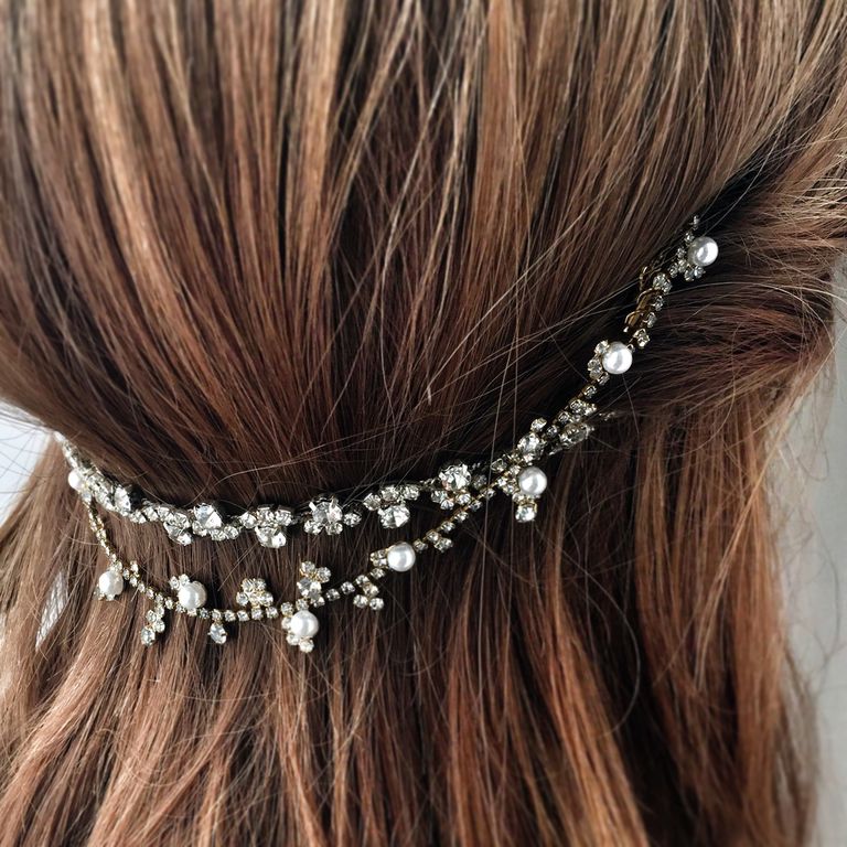 簡單的髮型最適合這種水晶和珍珠交互搭配的裝飾,有層次又有低調優雅的視覺,重點就是水晶和珍珠要挑選差不多大的。