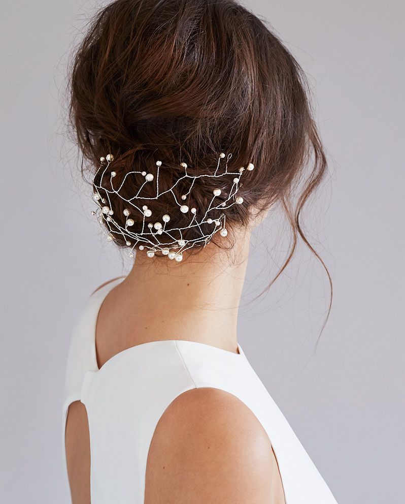 如果要有很強烈的吸睛度,那就要像Inmaculada Garcia這種大顆珍珠髮飾,原則是數量不能多,這還把髮型盤成貝殼狀的包頭,增加了夏日婚禮的趣味。